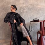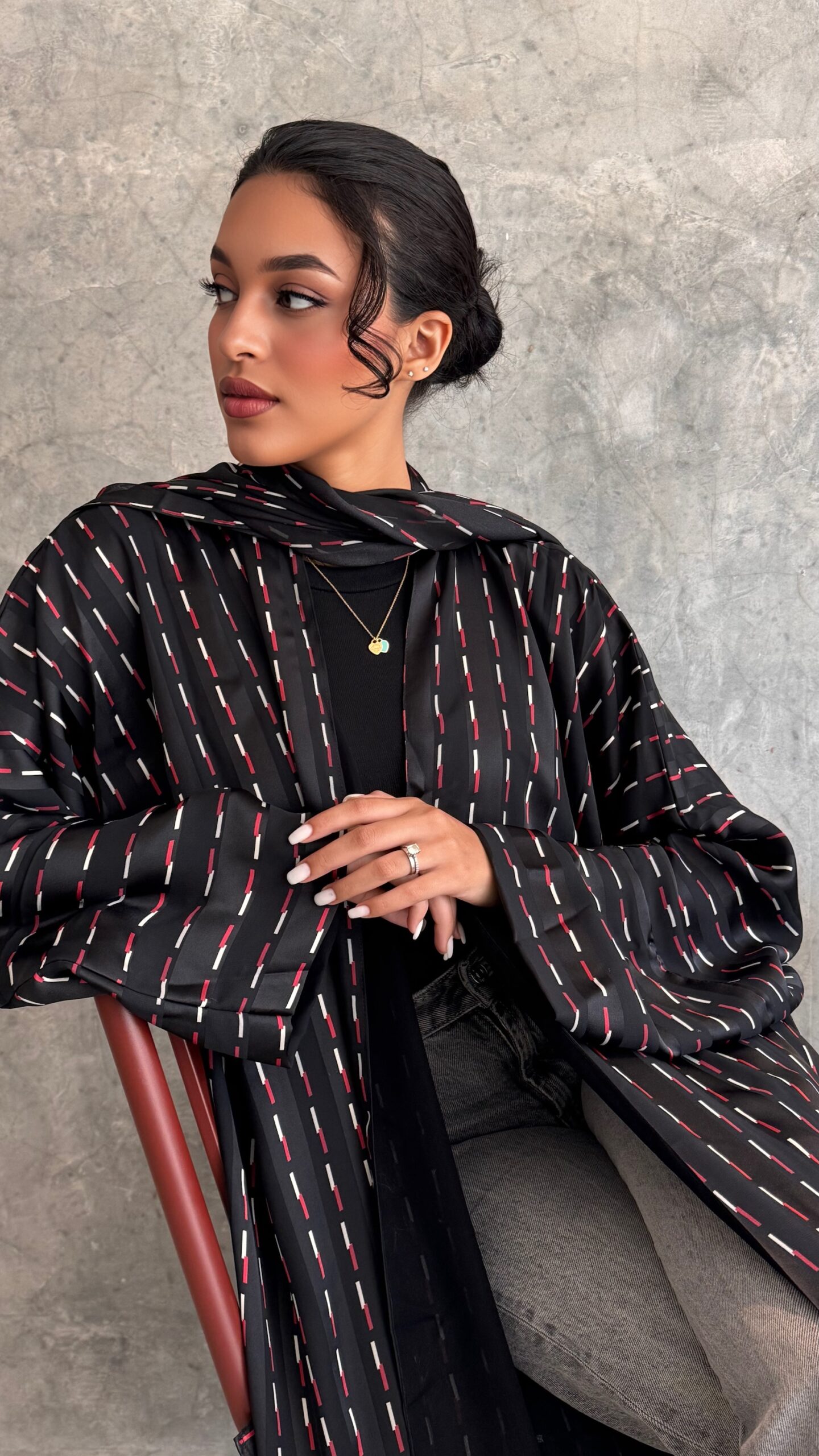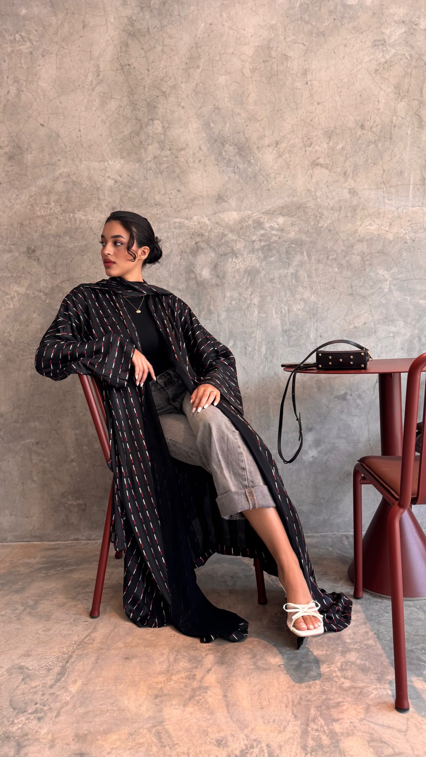 Modern bisht -flowy cut/ featuring a black base with minimal red and white line pattern