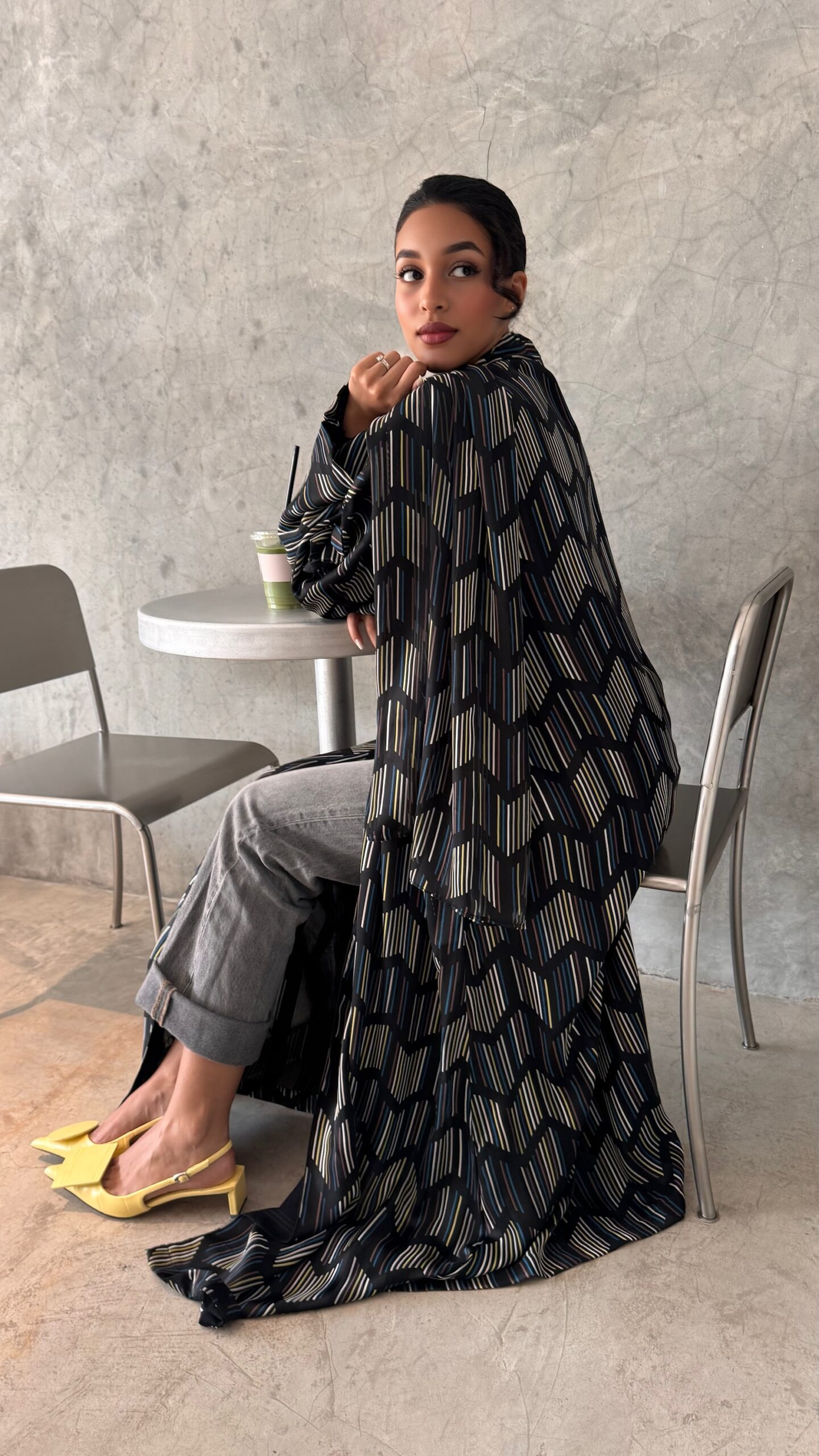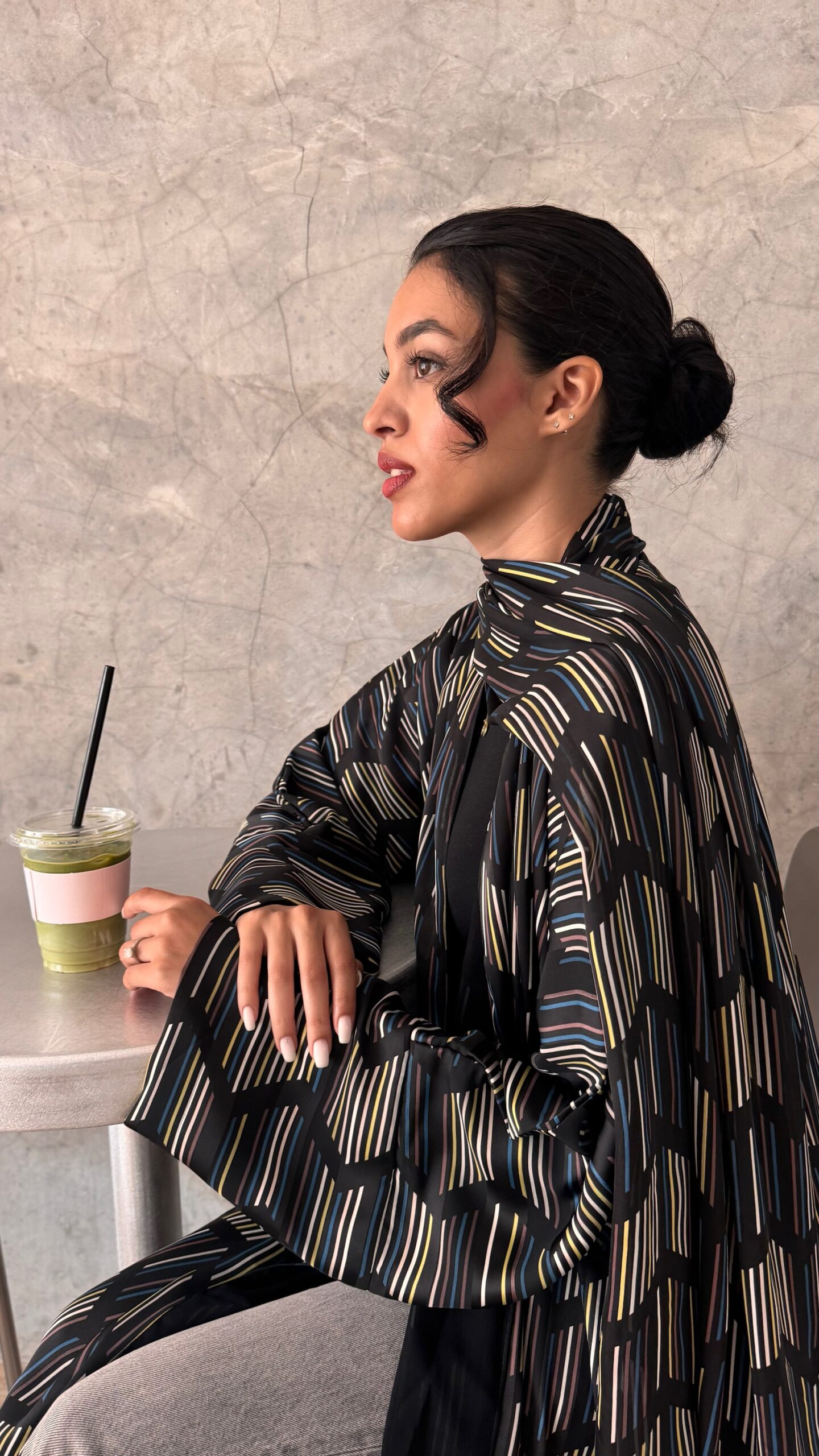 / featuring a pattern of diagonal and vertical lines in soft , muted tones , creating a modern geometric flow across the piece